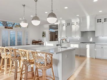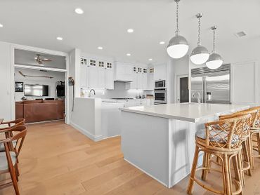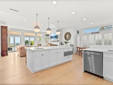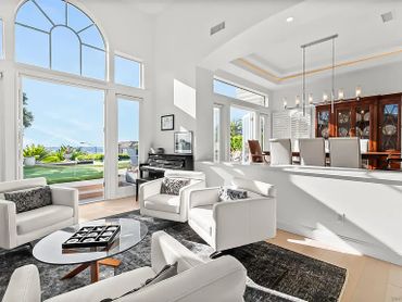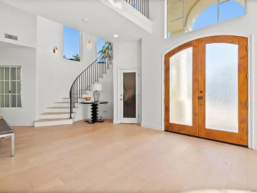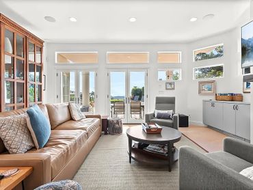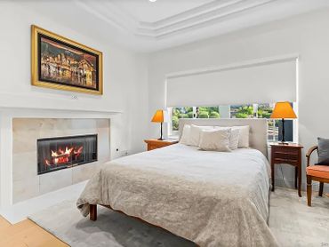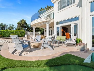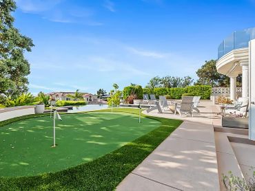 Stunning views from the lavish primary suite with built-in fireplace, huge walk-in closets, and a private balcony retreat. Outside is a complete tropical panoramic coastal view. The backyard is tailored for entertaining with mini golf green, outdoor fire pit, and infinity pool nestled under the master balcony. Easy access to Torrey Pines Golf Course.
