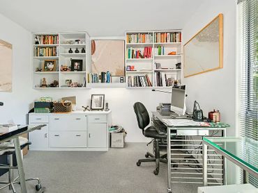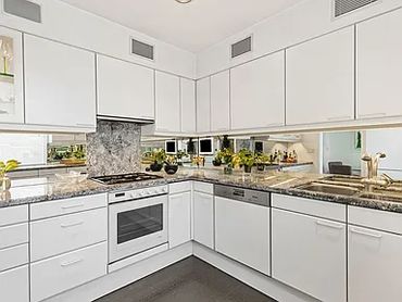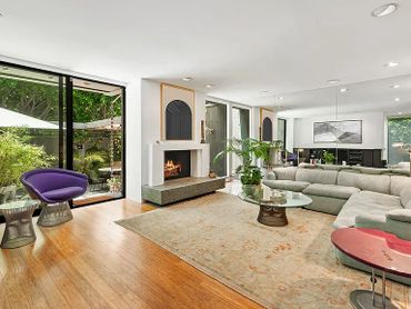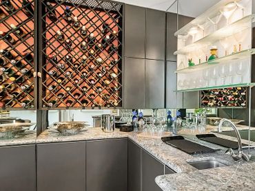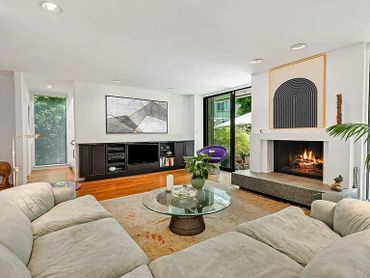 The entry welcomes you with stone tile floors and a mirrored accent wall, setting a polished tone. Ascend the stairs to the main living floor where curated details and natural textures define the space.The powder room features stone counters, a modern sink, and a sleek vanity. The hearth boasts warm wood floors, a fireplace with a stone hearth, recessed lighting, and sliding glass doors that open to a private patio. Ideal for seamless entertaining, the adjacent dining area features additional built-ins and a stone sideboard. A nearby wet bar includes granite counters, a sink, wine storage racks, and ample cabinetry, perfect for hosting.