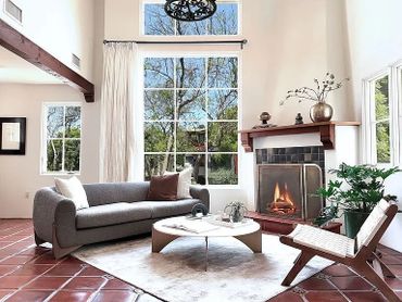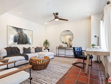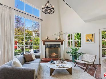Inviting living room with soaring ceiling, grand two-story fireplace and balcony, with views of the Hollywood Hills and city lights. The open living space incorporates the kitchen, dining area, and powder room, providing a perfect flow for entertaining. The separate office connected by a private breezeway is the perfect space, replete with views of West Hollywood and into Century City. A beautiful hardwood stairway takes you to the Primary Suite, situated on its own floor with wonderful French doors to Romeo & Juliet balcony, large walk-in closet, plus additional closet, dual sinks, large tub & separate shower. Additional bedroom suite on 3rd floor has fireplace, full bath and views.